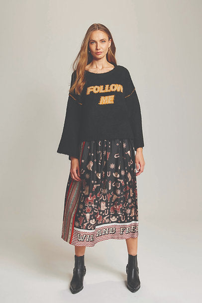 THE ME369 classic, the Vanessa skirt is a year-round style winner! So cool, so smile inducing and so easy to style. This versatile beauty is super comfortable in lightweight viscose, with a beautiful sheen to the finish and midi length. As always, these skirts really have to be seen in real life to fully appreciate their print genius... Cowboy-cool is a total vibe right now, so we're loving the 'Wild & Free' spirit and Rodeo themed print. The rich earthy colour way looks luxurious and chic with classic, neutral knits or simple tee's.