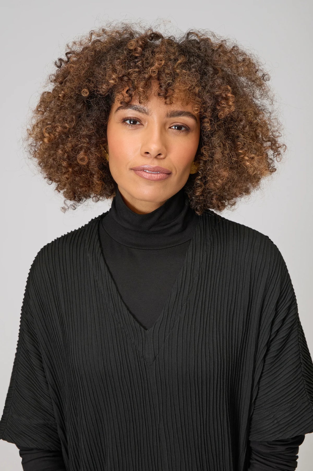 The Sahara Textured Wave Jersey Dress is crafted from a pleated-effect viscose jersey that has a natural stretch, creating a sculptural, rippled finish. Its kaftan-inspired, architectural silhouette features a relaxed cocoon shape that drapes smoothly over the body. A V-neck highlights the collarbone, while cropped sleeves and front seam pockets offer both comfort and functionality. The midi length brings the look together with balanced proportions and ease.