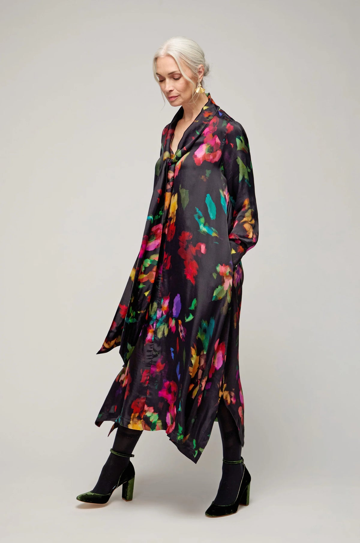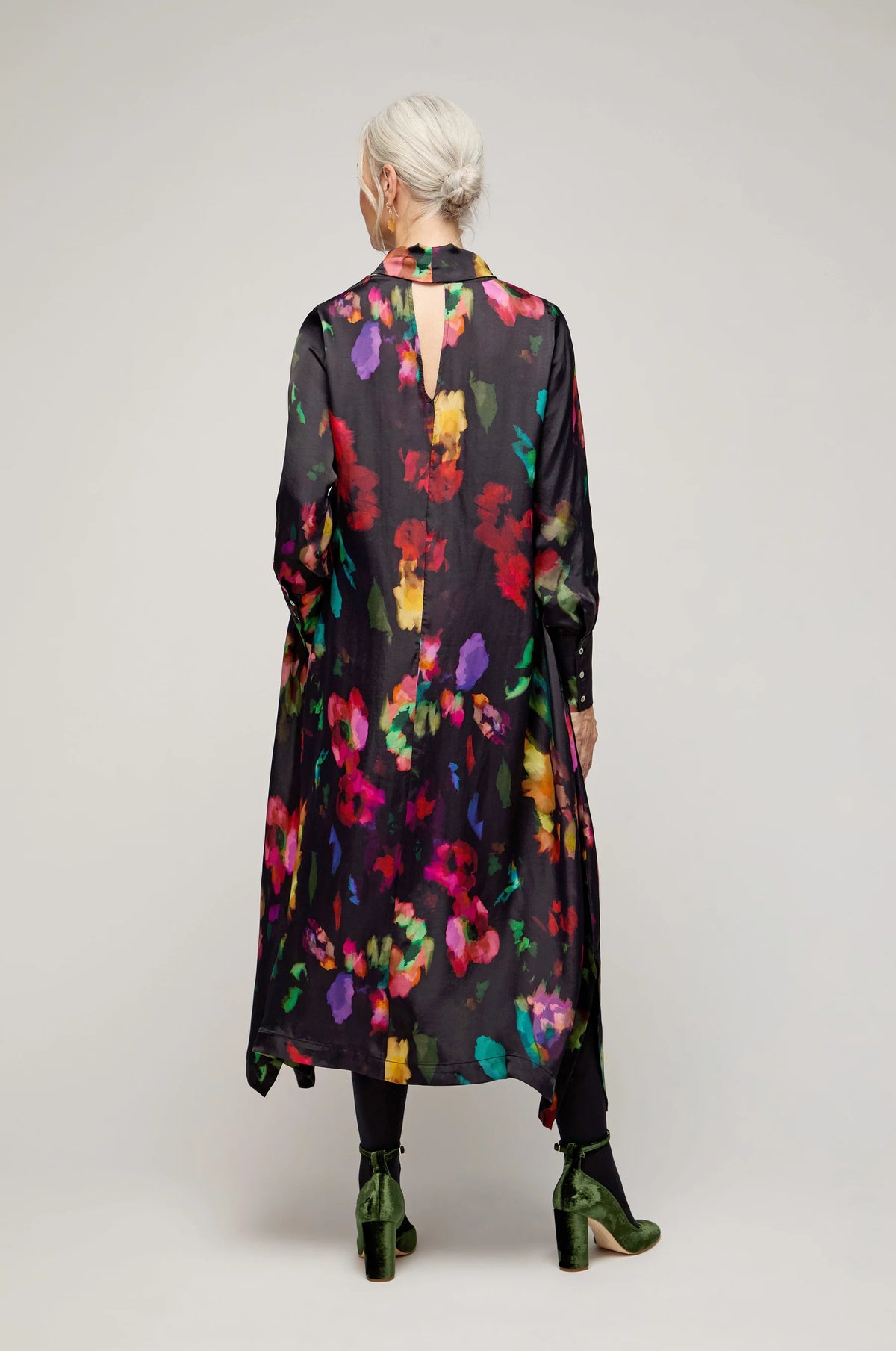 The Sahara Winter Floral Tie Neck Dress celebrates colour and movement in a striking way. Its brushstroke-inspired floral print sweeps across the fabric in lively, multi-tonal hues. A relaxed silhouette offers effortless comfort, while the tie-neck detail adds adaptable styling—leave it draped for a soft look or tie it for a more defined finish. Gentle shaping and fluid fabric contribute to a silhouette that is both easygoing and refined.