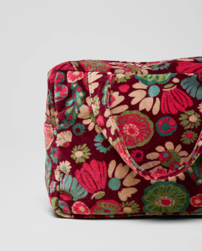 Soft, colourful, and full of charm, this velvet bag adds a playful touch to any outfit. The bold striped floral print makes it a standout piece, while the padded shape and top handles keep it practical and easy to carry. Spacious enough for your daily essentials, it’s the perfect everyday companion with a cheerful twist. Style it with a simple knit and jeans to let the print shine.