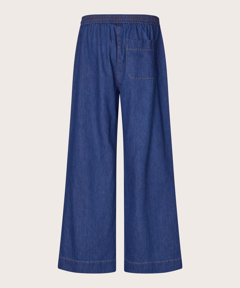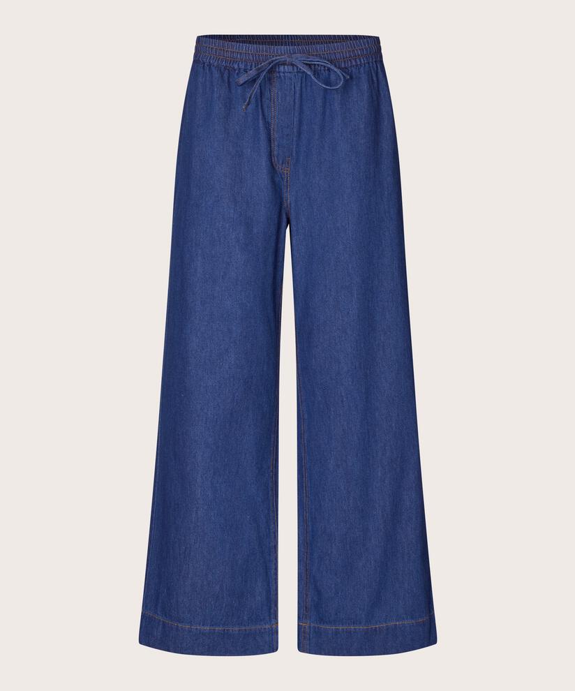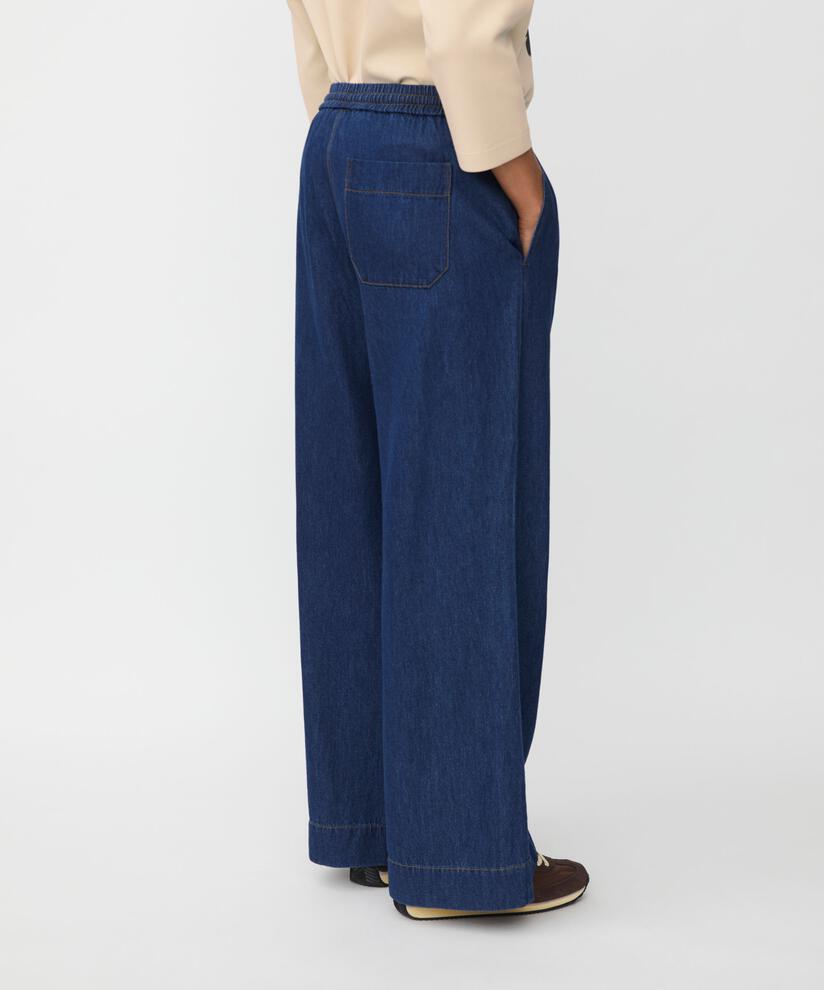 These beautiful denim trousers offer the perfect blend of effortless comfort and classic denim style. Crafted from soft, lightweight denim with an elasticated waistband, they’re so comfortable you’ll hardly want to take them off. The design includes a waist tie, side slit pockets, and long, wide legs that create a graceful silhouette and a wonderfully relaxed vibe. Pair them with a top, shirt, knit, or matching jacket. Denim works with everything—and these trousers are no exception.