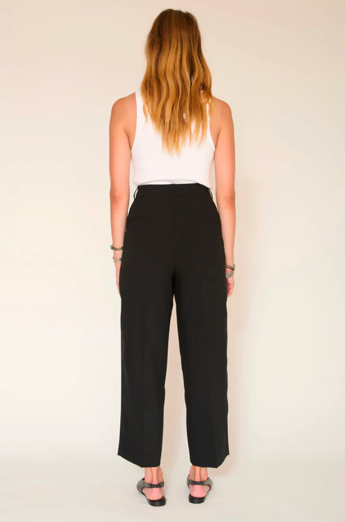 The Paroche black trousers bring refined elegance to your wardrobe with their flattering slim fit and high-waisted silhouette. Crafted from a soft, stretchy blend, they offer all-day comfort while maintaining a sleek, polished look. Discreet side pockets and clean tailoring make them versatile for both work and evening occasions. Pair them with a relaxed knit and loafers for an effortlessly sophisticated outfit.