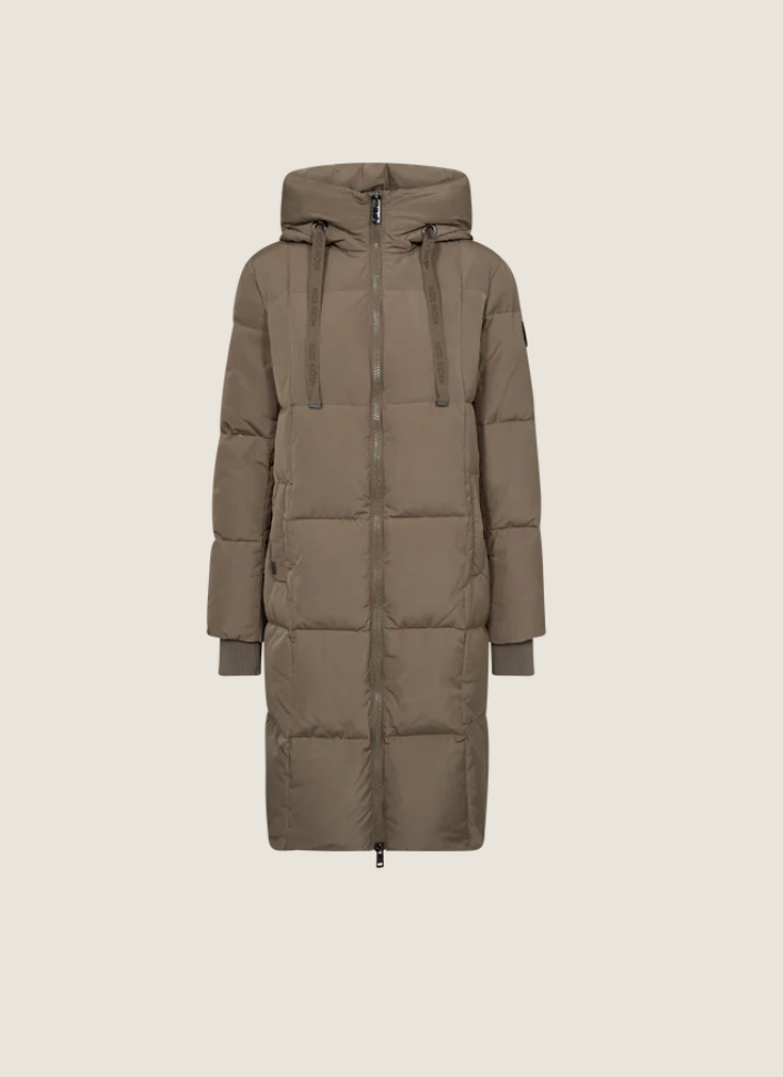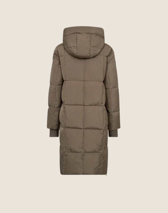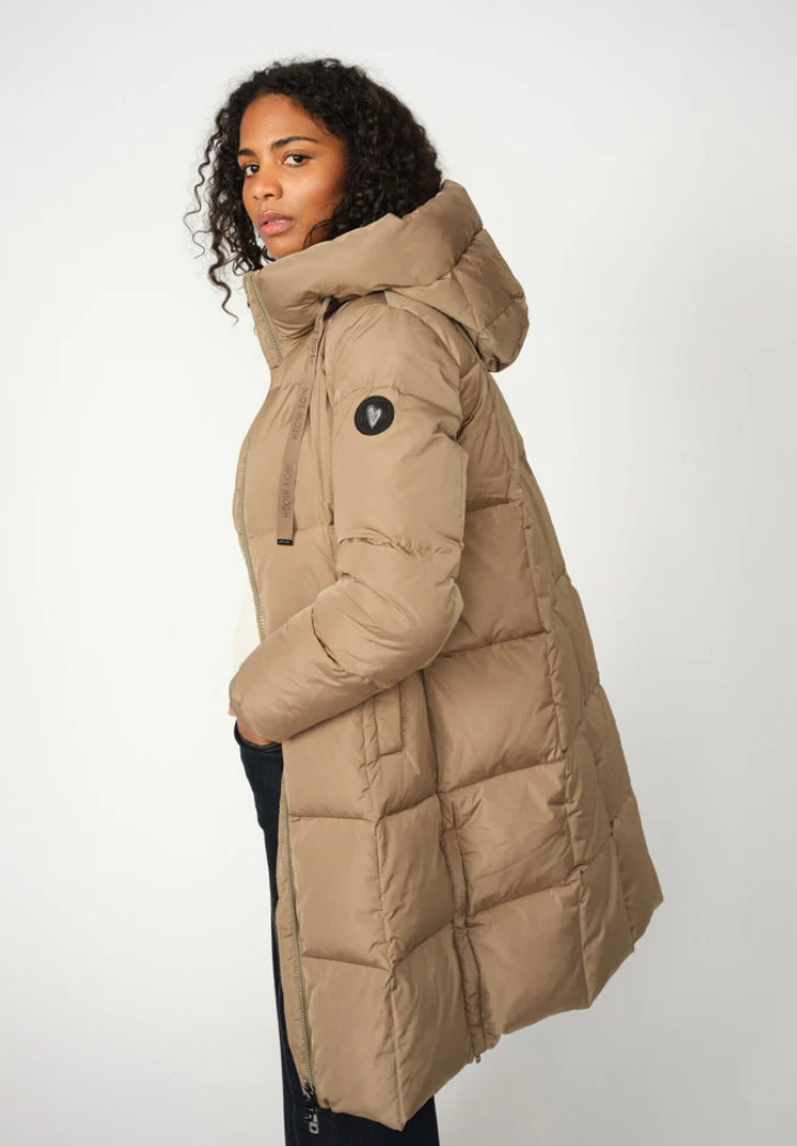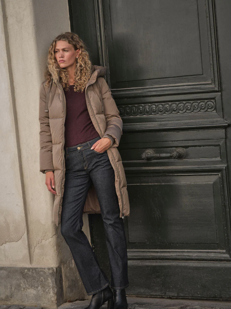 Brave the cold in this ultra-light yet incredibly warm down coat, designed for cosy comfort on the chilliest days. The long silhouette, hood, and high collar offer maximum protection, while the check-quilted pattern brings a modern, stylish touch. Side slits add ease of movement, making it practical for everyday wear. Layer it over a chunky knit with straight-leg jeans and sleek trainers for a relaxed, winter-ready look.