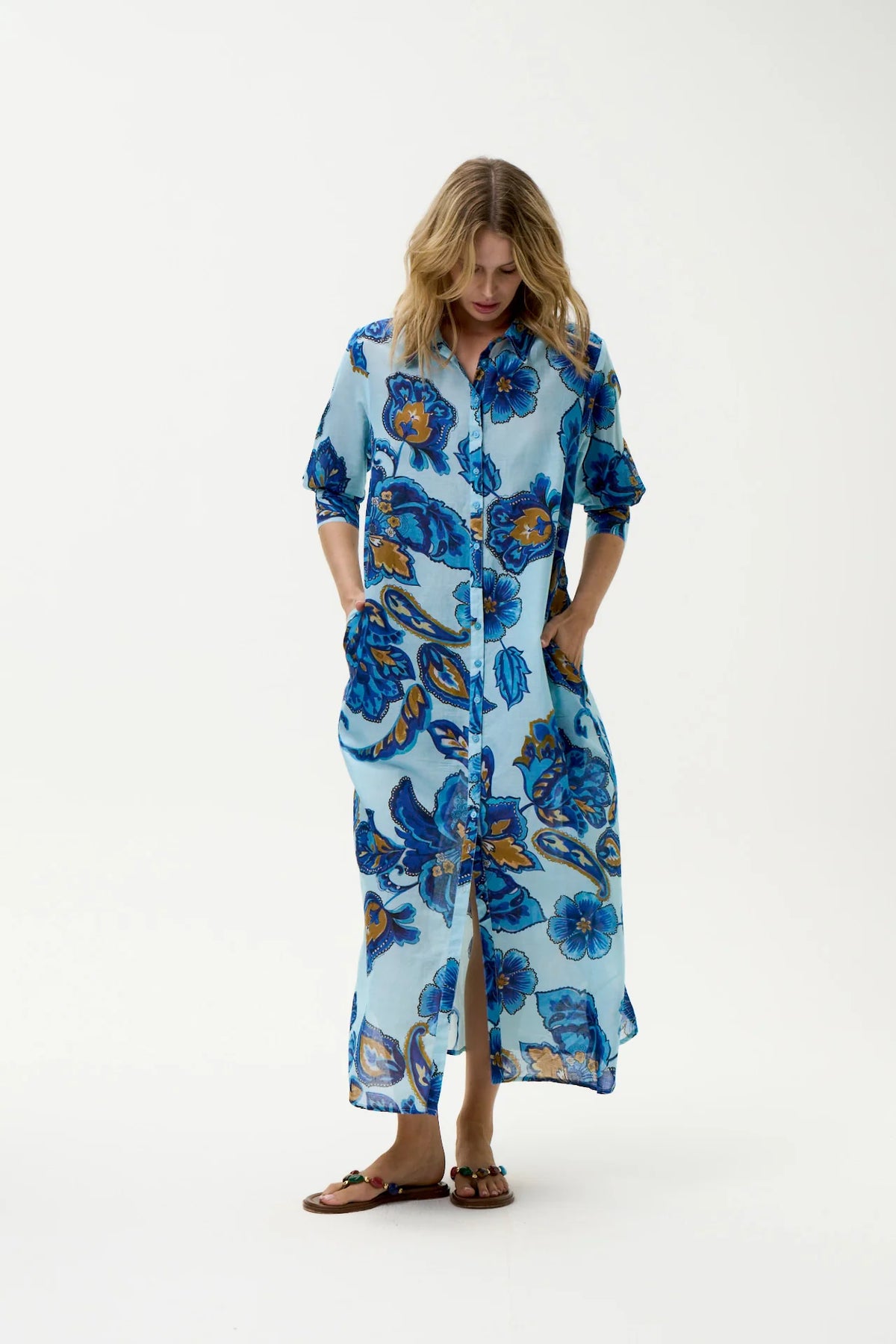 Made from 100% washed cotton, the Daisy is a laid-back button-down shirt dress featuring a flowing full-length cut, a soft collar, and practical side pockets. Designed for easy movement and all-day comfort, it’s ideal for relaxed holiday dressing.